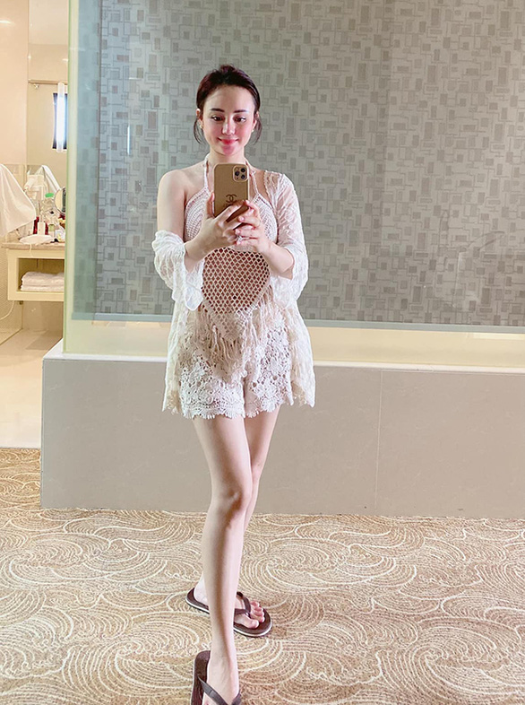 Ca sĩ Vy Oanh tranh thủ selfie khi cùng chồng con đi chơi. Vóc dáng thon gọn của bà mẹ ba con khiến nhiều người bất ngờ.