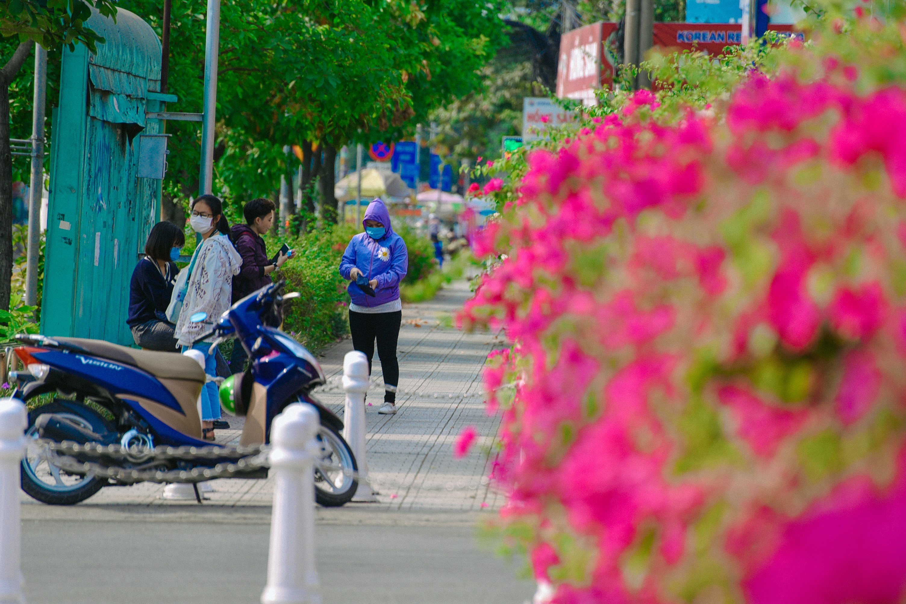 Dọc tuyến Nguyễn Hữu Thọ (quận 7, TP CM) nở rực hoa giấy làm người đi đường không khỏi rời mắt và thu hút nhiều bạn trẻ tìm đến để check-in dịp cuối tuần.