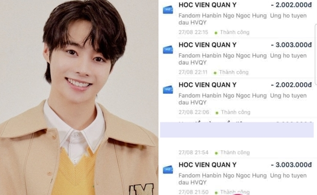 Bên cạnh đó, fan Hanbin còn ủng hộ 10 triệu đồng để mua quần áo bảo hộ cấp 4 và khẩu trang y tế N95 cho lực lượng bác sĩ, điều dưỡng và học viên Học viện Quân y đang tham gia tuyến đầu chống dịch ở TP. Hồ Chí Minh và Bình Dương.