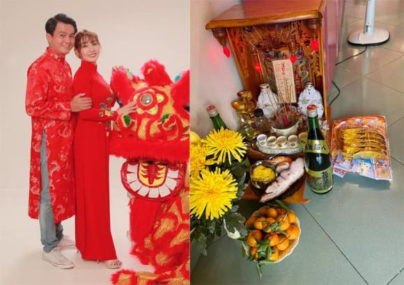 Vợ chồng Thu Trang - Tiến Luật cũng chuẩn bị mâm cỗ cúng thịnh soạn với heo quay, xôi, chè, bánh hũ vàng... Nữ diễn viên cầu mong một năm thành công, thuận lợi đến với công ty và gia đình.