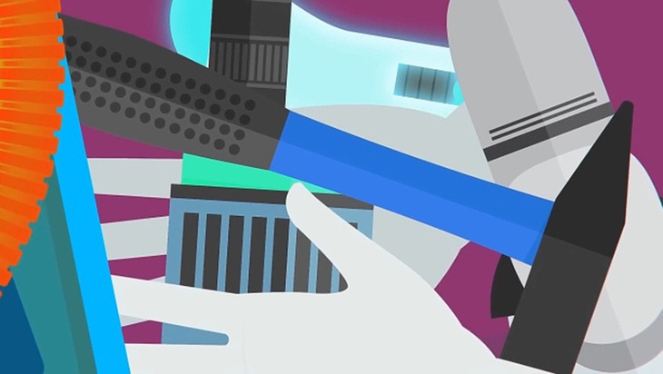 - Bác sĩ thú y mang đèn laser, búa, máy khoan, đèn huỳnh quang và một đôi găng tay cao su.