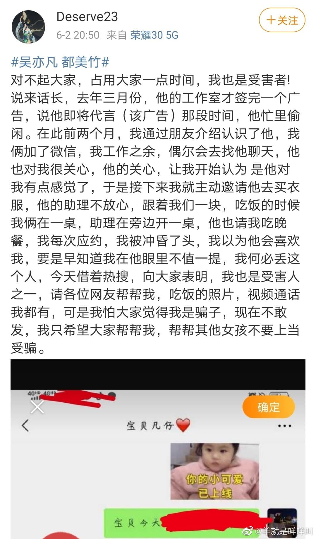 Một cô gái với tài khoản weibo Deserve23 đã lên tiếng chia sẻ rằng: “Anh ta rất quan tâm đến tôi, khiến tôi thấy vui vẻ, tôi cảm thấy anh ấy có chút tình cảm với mình, vì thế tôi cũng đã chủ động rủ anh ấy đi mua sắm, trợ lý của Ngô Diệc Phàm không yên tâm nên đi cùng.